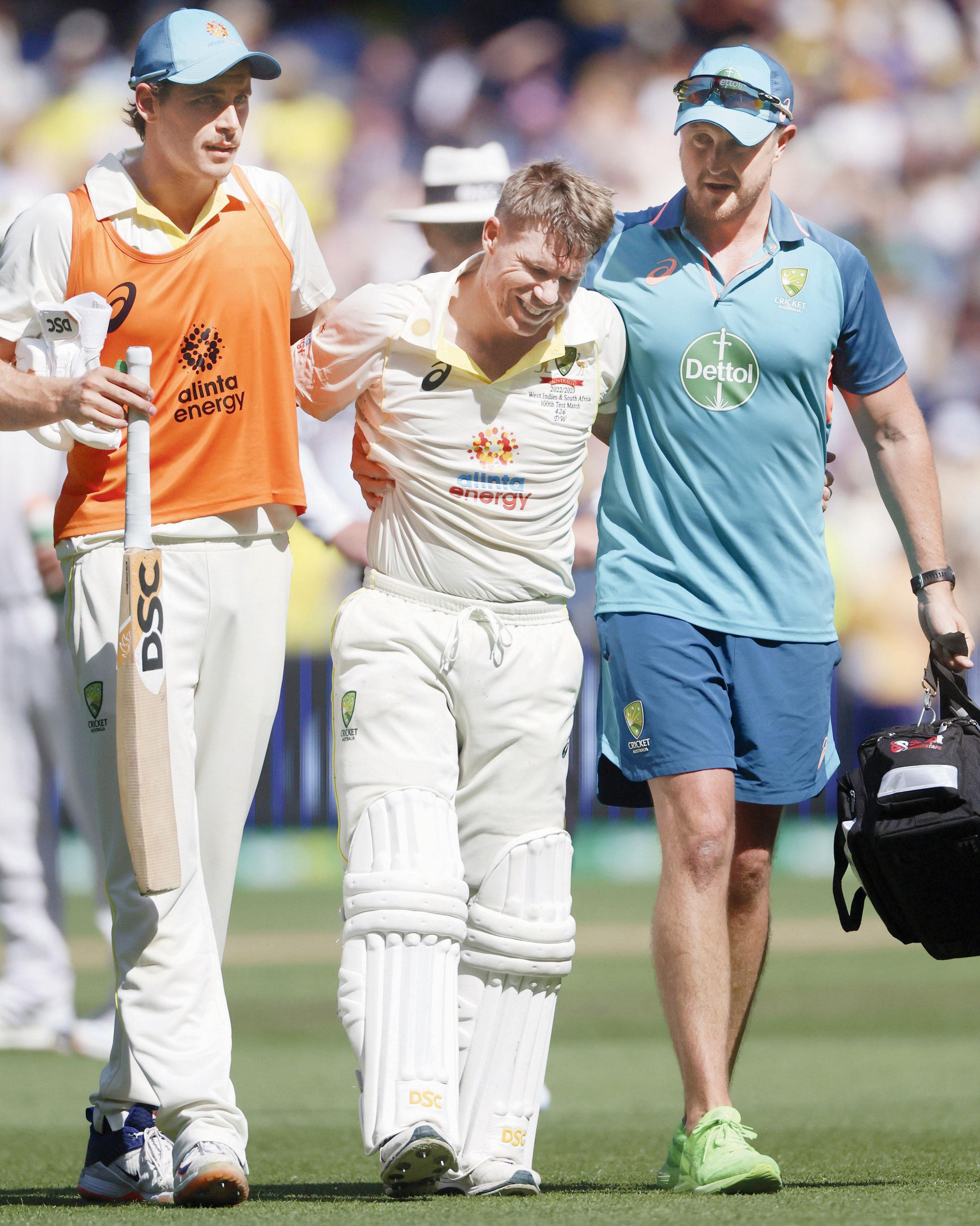 ડેવિડ વૉર્નર ગઈ કાલે મેલબર્નમાં ૯૯ ડિગ્રી ફૅરનહાઇટ ગરમી વચ્ચે ઐતિહાસિક ડબલ સેન્ચુરી પૂરી કરીને રાબેતા મુજબના સેલિબ્રેશનમાં ઊંચે કૂદ્યો ત્યારે તેના ડાબા પગના સ્નાયુઓ ખેંચાઈ ગયા હતા અને ઘૂંટણિયે બેસી પડ્યો હતો. તે રિટાયર હર્ટ થઈને મેડિકલ સ્ટાફના સભ્યોની મદદથી મેદાનની બહાર ગયો હતો. એ સમયે ૪૨,૦૦૦ પ્લસ પ્રેક્ષકોએ ઊભા થઈને તેને શાનદાર ઇનિંગ્સ બદલ અભિનંદન આપ્યાં હતાં. તસવીર એ.પી.
