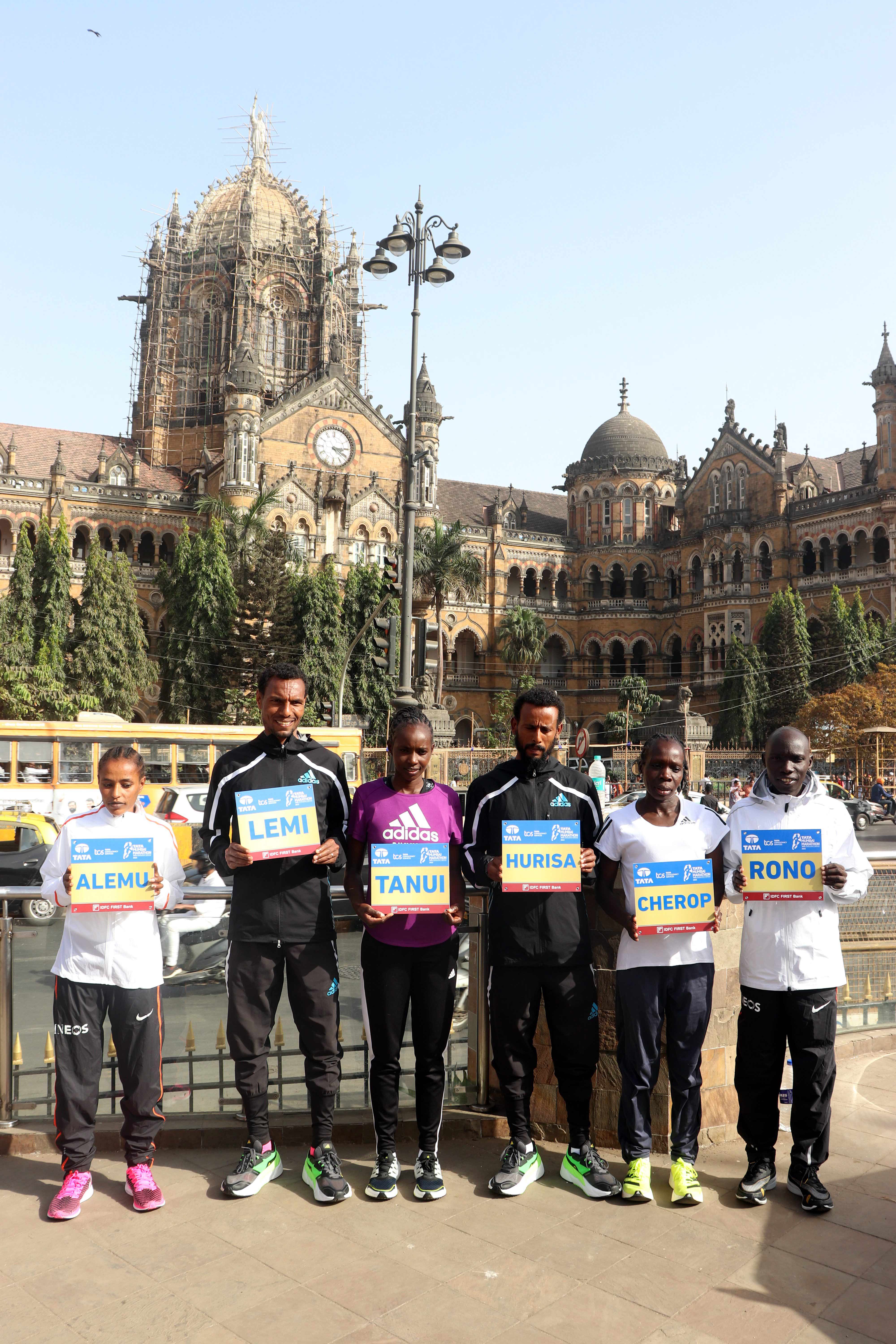 ગઈ કાલે છત્રપતિ શિવાજી મહારાજ ટર્મિનસની નજીક પોઝ આપી રહેલા રવિવારની ટાટા મુંબઈ મૅરથોનના ટોચના રનર્સ. પછીથી તેઓ પત્રકારોને મળ્યા હતા. આ રનર્સમાં ડિફેન્ડિંગ ચૅમ્પિયન ડેરારા હુરિસા અને લેમી બેરહાનુ, ફિલેમૉન રૉનો તેમ જ મહિલા રનર્સ વર્કનેશ આલેમુ, શેરૉન ચેરૉપ, રોડાહ જેપકોઇર તાનુઇનો સમાવેશ હતો. છ કૅટેગરીમાં કુલ ૫૫,૦૦૦ ઍમેટર્સ પણ આ મૅરથોનમાં ભાગ લેશે. વિજેતા મુખ્ય રનરને ૪૫,૦૦૦ ડૉલરનું ઇનામ અપાશે. તસવીર: અનુરાગ આહિરે