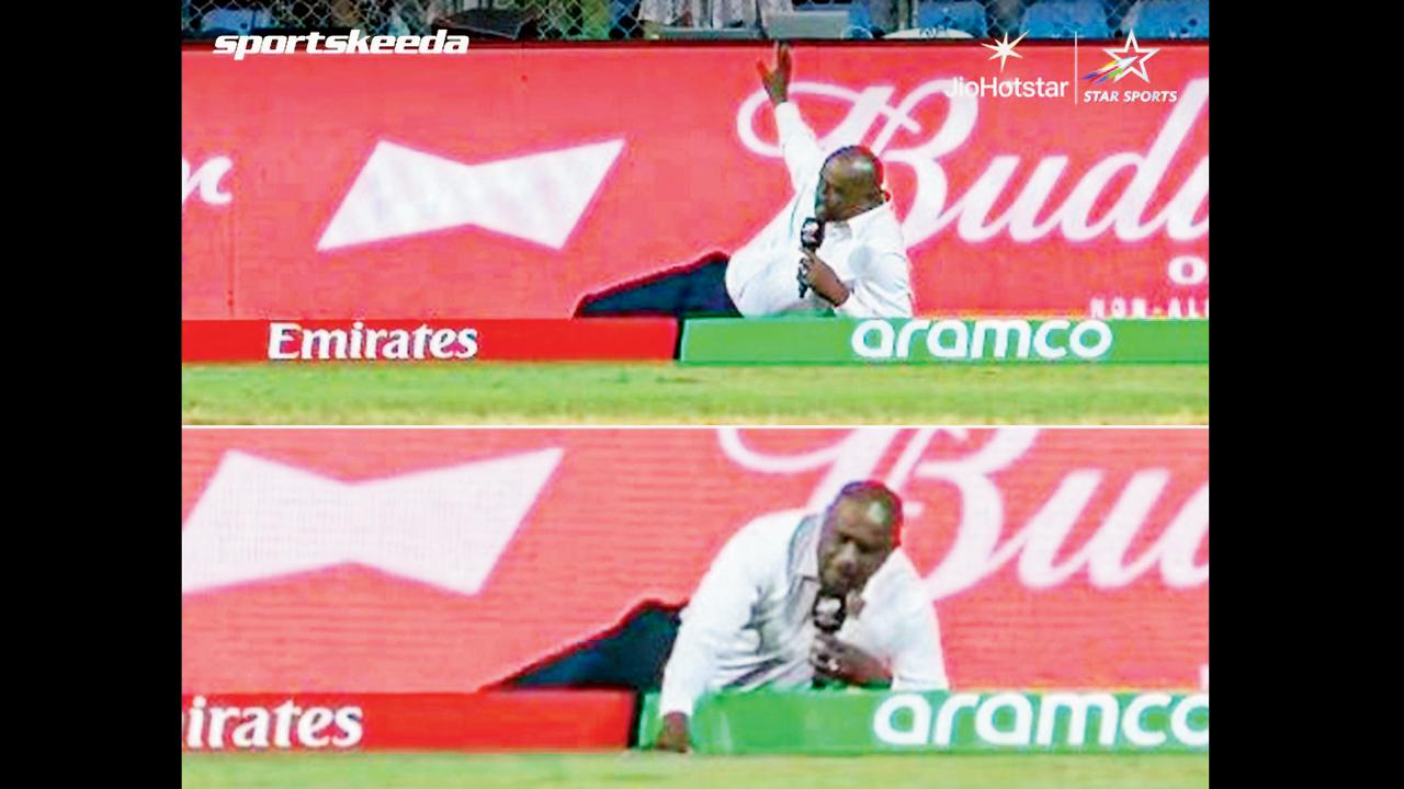 કૉમેન્ટેટર ઇયાન બિશપ વાનખેડે સ્ટેડિયમમાં ગઈ કાલે બાઉન્ડરી લાઇન પાસે સૂઈને અનોખા અંદાજમાં ઝાકળ માટે રિપોર્ટિંગ આપતો જોવા મળ્યો હતો