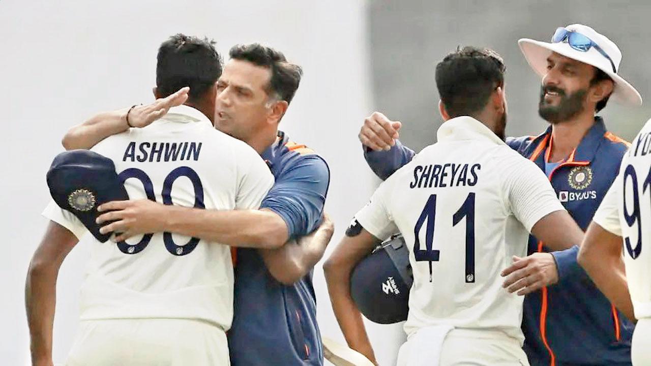 ગઈ કાલની જીતના સૂત્રધાર અશ્વિનને હેડ-કોચ દ્રવિડ પાસેથી અને શ્રેયસને બૅટિંગ-કોચ વિક્રમ રાઠોર પાસેથી ખૂબ શાબાશી મળી હતી (ઉપર). પછીથી ભારતીય ખેલાડીઓને ટ્રોફી સોંપાઈ ત્યારે વચ્ચે જયદેવ ઉનડકટને ઊભા રહીને ટ્રોફી લિફ્ટ કરવાનું ગૌરવ અપાયું હતું. તસવીર એ.પી./એ.એફ.પી.
