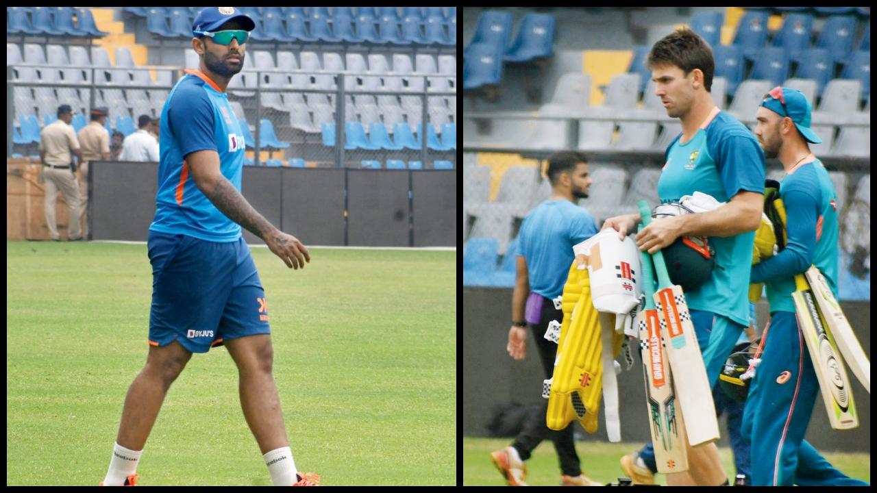 વાનખેડેમાં ગઈ કાલે સૂર્યકુમાર યાદવે (ડાબે) ઘણી બૅટિંગ-પ્રૅક્ટિસ કરી હતી. મોડેથી ઑસ્ટ્રેલિયન ખેલાડીઓ પણ સરસામાન સાથે મેદાન પર ઊતર્યા હતા (જમણે). તસવીર આશિષ રાજે