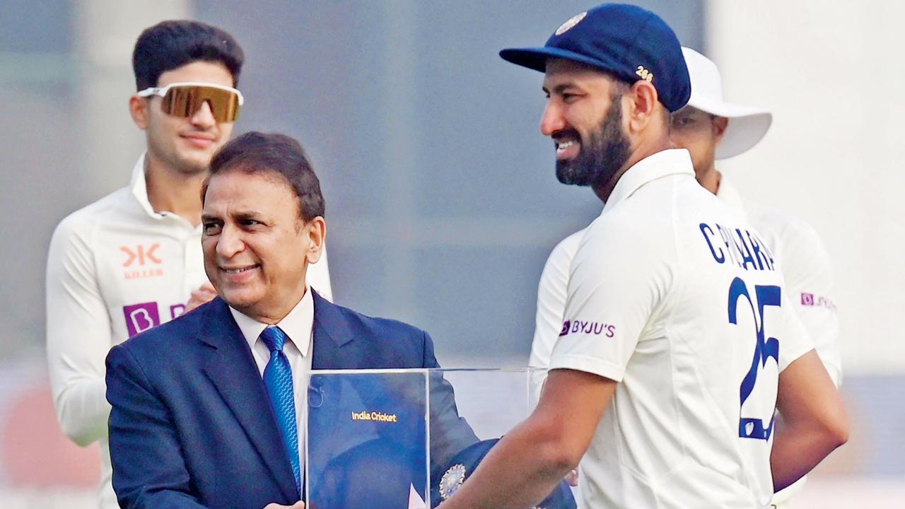 વેલકમ ટુ ૧૦૦ ટેસ્ટ ક્લબ : ચેતેશ્વર પુજારાએ ગઈ કાલે ૧૦૦મી ટેસ્ટ રમવા બદલ સન્માન તરીકે સુનીલ ગાવસકરના હસ્તે સ્પેશ્યલ કૅપ મેળવ્યા બાદ આ ઐતિહાસિક પળ દરમ્યાન પિતા અરવિંદ પુજારા અને પત્ની પૂજા તથા પુત્રી અદિતિ સાથે ફોટો પડાવ્યો હતો. (તસવીર : પી.ટી.આઇ અને એ.એફ.પી.)