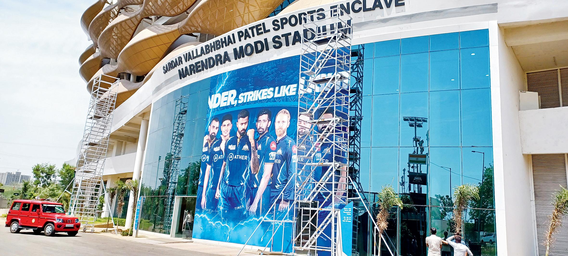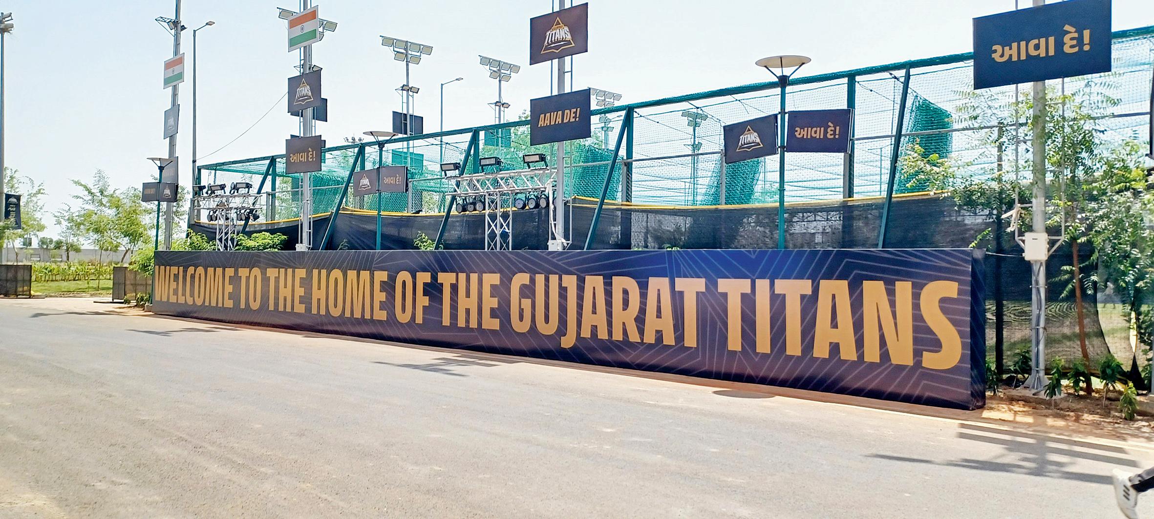 નરેન્દ્ર મોદી સ્ટેડિયમમાં ગુજરાત ટાઇટન્સ ટીમને આવકારતું બૅનર.