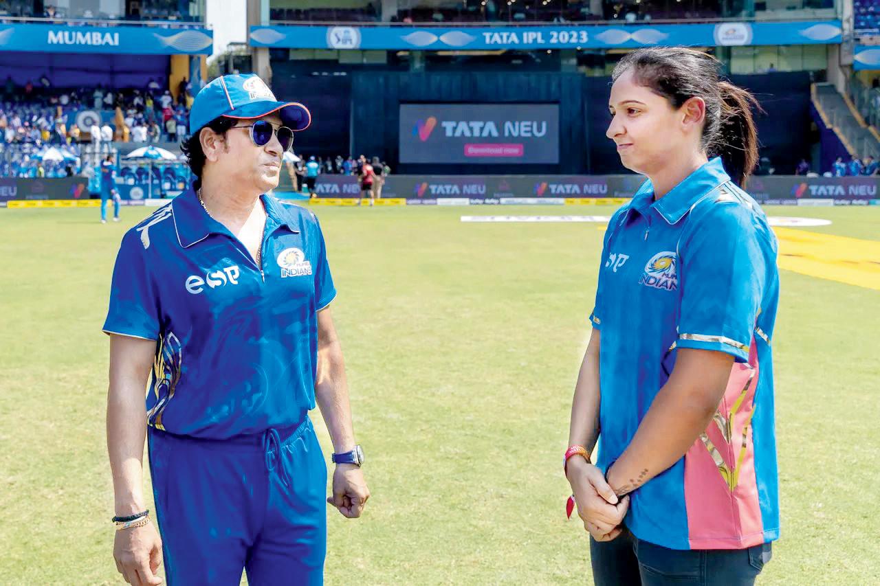 ગઈ કાલે વાનખેડેની મૅચ પહેલાં સચિન તેન્ડુલકર અને સૌપ્રથમ ડબ્લ્યુપીએલની ચૅમ્પિયન કૅપ્ટન મુંબઈ ઇન્ડિયન્સ વિમેનની હરમનપ્રીત કૌર. એમઆઇ દ્વારા ગઈ કાલે ‘એજ્યુકેશન ઍન્ડ સ્પોર્ટ્સ ફૉર ઑલ’ અભિયાન યોજાયું હતું.