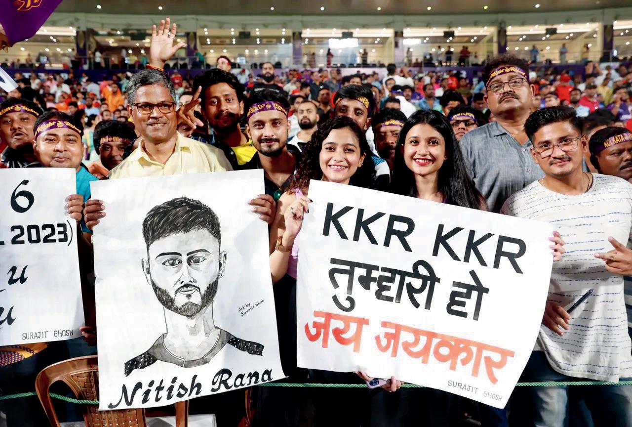 ઈડનમાં સોમવારે બૅનર સાથે કલકત્તા નાઇટ રાઇડર્સના ફૅન્સ. તસવીર iplt20.com