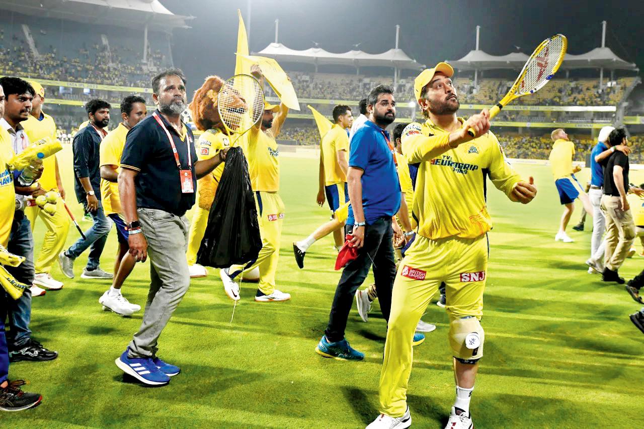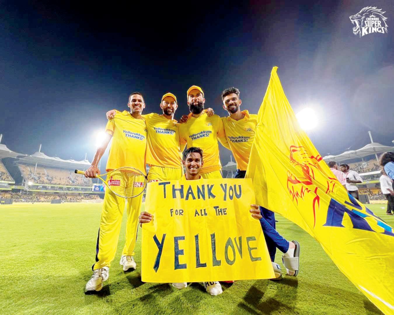 ચેન્નઈના ખેલાડીઓએ રવિવારે ચેન્નઈના મેદાન પરની આખરી લીગ મૅચ રમ્યા પછી એક ચાહકના બૅનર પાસે ઊભા રહીને ફોટો પડાવ્યો હતો.