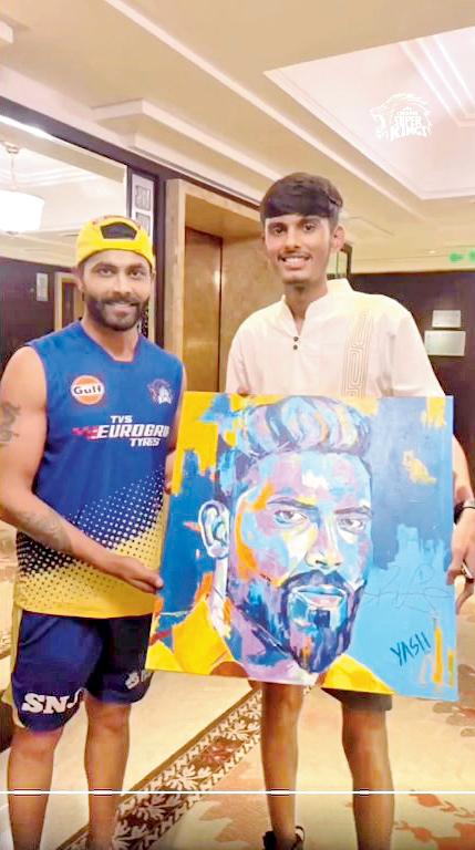 જાણીતા યુવાન આર્ટવર્ક સ્પેશ્યલિસ્ટ યશ પ્રજાપતિએ ભારતના ટોચના ઑલરાઉન્ડર અને સીએસકેના ખેલાડી રવીન્દ્ર જાડેજાનું પેઇન્ટિંગ બનાવ્યું છે જે યશે રવિવારે જાડેજાને બતાવ્યું હતું અને એના પર તેના ઑટોગ્રાફ લીધા હતા. જાડેજાએ જણાવ્યું કે ‘યશે બનાવેલું પેઇન્ટિંગ ખરેખર બહુ સરસ છે. મને ખૂબ ગમ્યું.’