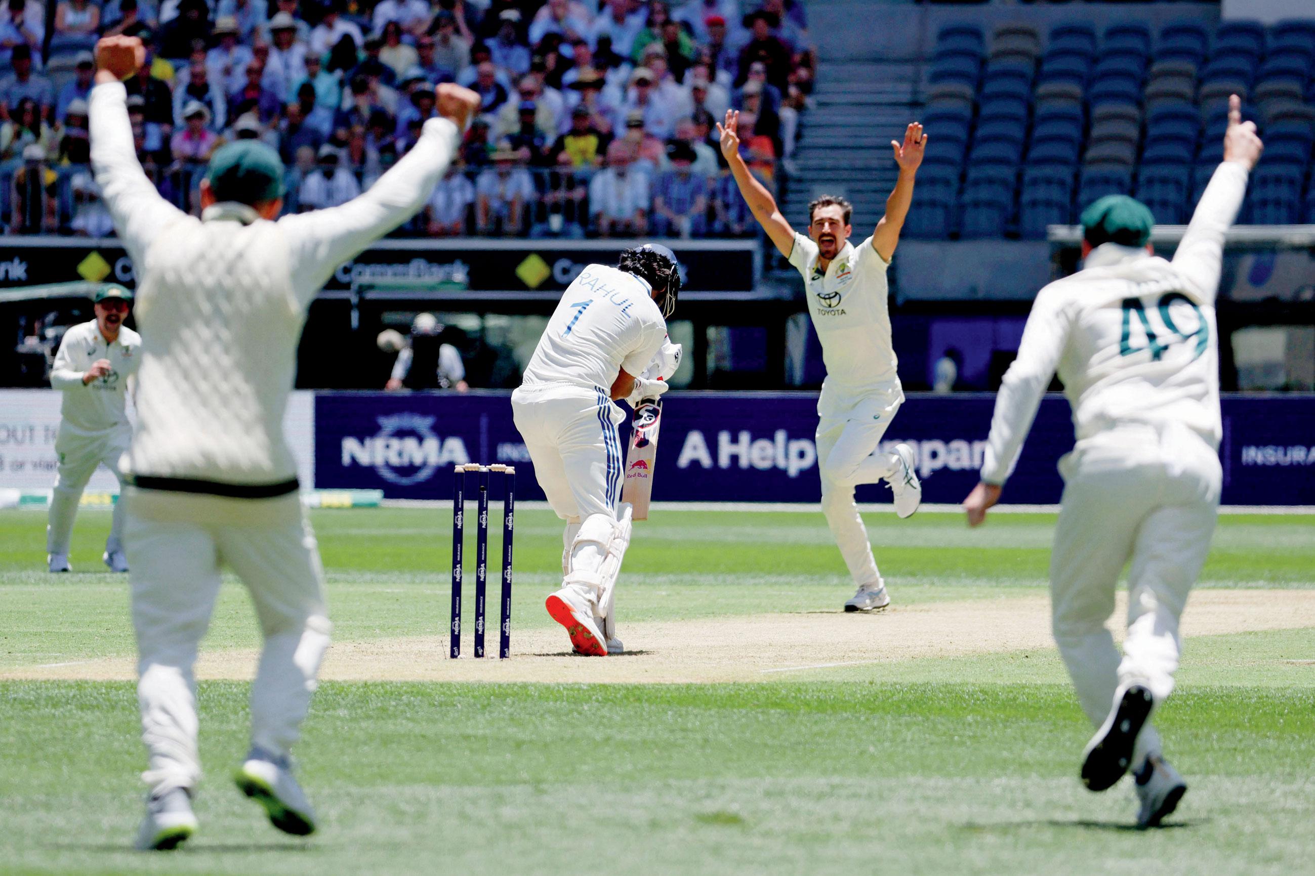 જસપ્રીત બુમરાહે ટૉસ જીતીને પહેલાં બૅટિંગ લીધી હતી; પણ શરૂઆતમાં મિચલ સ્ટાર્ક અને જોશ હેઝલવુડના તરખાટ સામે ભારતીય બૅટરો ઘૂંટણિયે પડી ગયા હતા. યશસ્વી જાયસવાલ અને દેવદત્ત પડિક્કલ ઝીરોમાં પૅવિલિયન ભેગા થયા હતા, જ્યારે વિરાટ કોહલી માત્ર પાંચ રન કરીને આઉટ થયો હતો. કે. એલ. રાહુલે ૭૪ બૉલમાં ધીરજભર્યા ૨૬ રન કર્યા હતા ત્યારે તેને વિવાદસ્પદ રીતે કૉટ-બિહાઇન્ડ અપાયો હતો, એવું લાગતું હતું કે બૉલ તેના બૅટને નહોતો લાગ્યો અને સ્નિકોમીટરમાં આવાજ બૅટ અને પૅડના સ્પર્શને લીધે આવ્યો હતો. કૉમેન્ટેટરો પણ થર્ડ અમ્પાયરના નિર્ણયથી અવાક હતા.