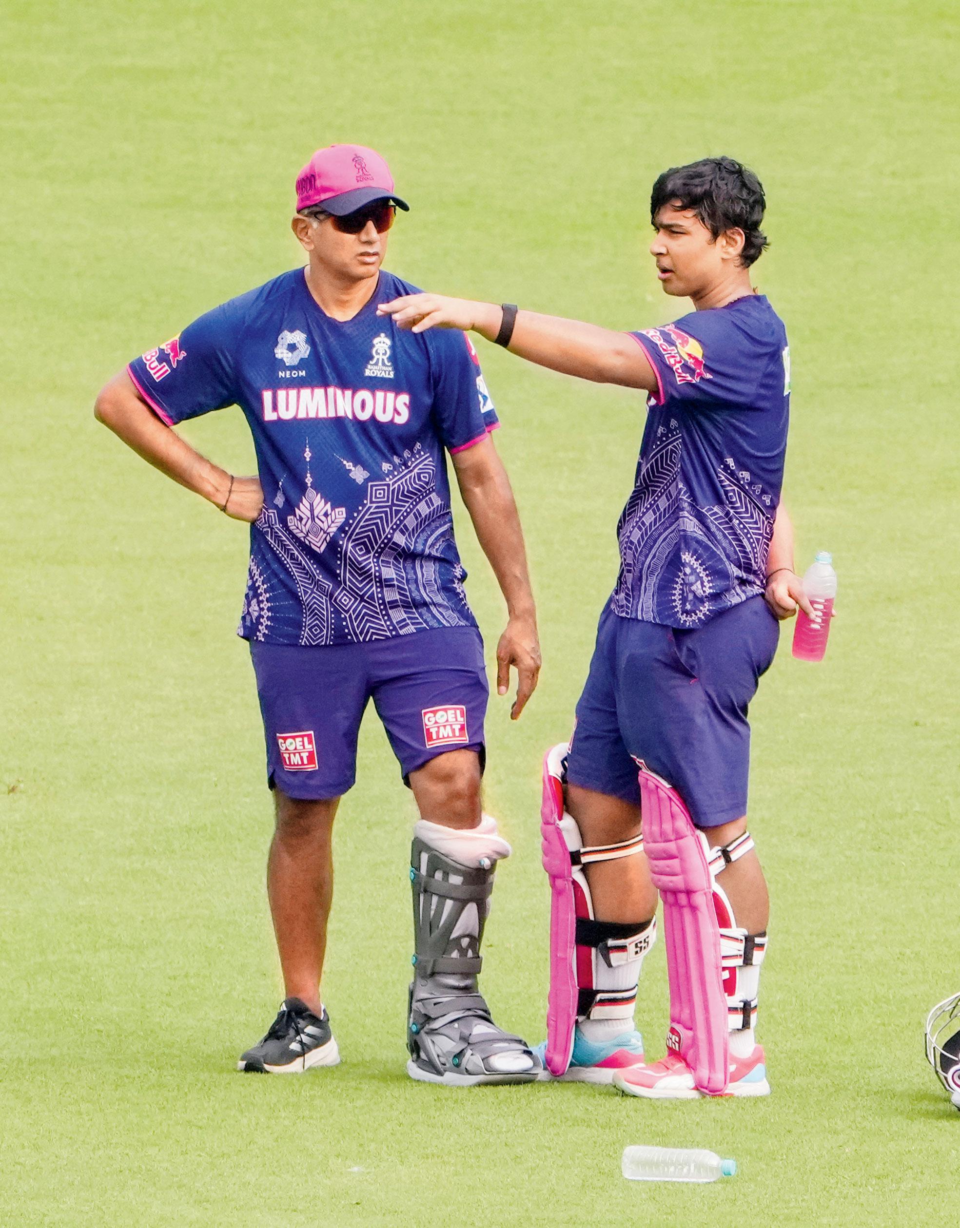 પ્રૅક્ટિસ દરમ્યાન રાજસ્થાનનો હેડ કોચ રાહુલ દ્રવિડ અને વૈભવ સૂર્યવંશી.