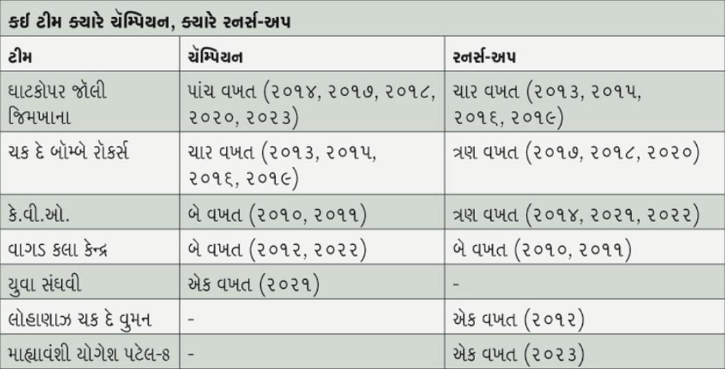 રેકૉર્ડ પાંચમી વાર ચૅમ્પિયન બનનાર ઘાટકોપર જૉલી જિમખાના ટીમ સાથે ટાઇટલ સ્પૉન્સર એમઆઇસીએલના મનન શાહ, ઍક્ટ્રેસ ભક્તિ રાઠોડ તથા ઘાટકોપર જૉલી જિમખાનાના ચૅરમૅન રજનીકાંતભાઈ શાહ અને મૅનેજિંગ કમિટી મેમ્બર્સ. ઘાટકોપર જૉલી જિમખાનાને ચૅમ્પિયન ટ્રોફી ઉપરાંત હેલ્થ પાર્ટનર આત્મયા, સ્ટાઇલ પાર્ટનર ઐશ્વર્યા અને પ્રાઇઝ સ્પૉન્સર મૅજિક મિરર-મિસ યુનિવર્સ તરફથી ગિફ્ટ હૅમ્પર તથા ગિફ્ટ વાઉચર આપવામાં આવ્યાં હતાં.