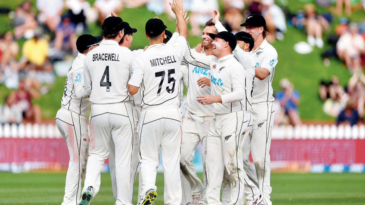 વેલિંગ્ટનમાં શ્રીલંકાની વિકેટની ઉજવણી કરતા ન્યુ ઝીલૅન્ડના ખેલાડીઓ.