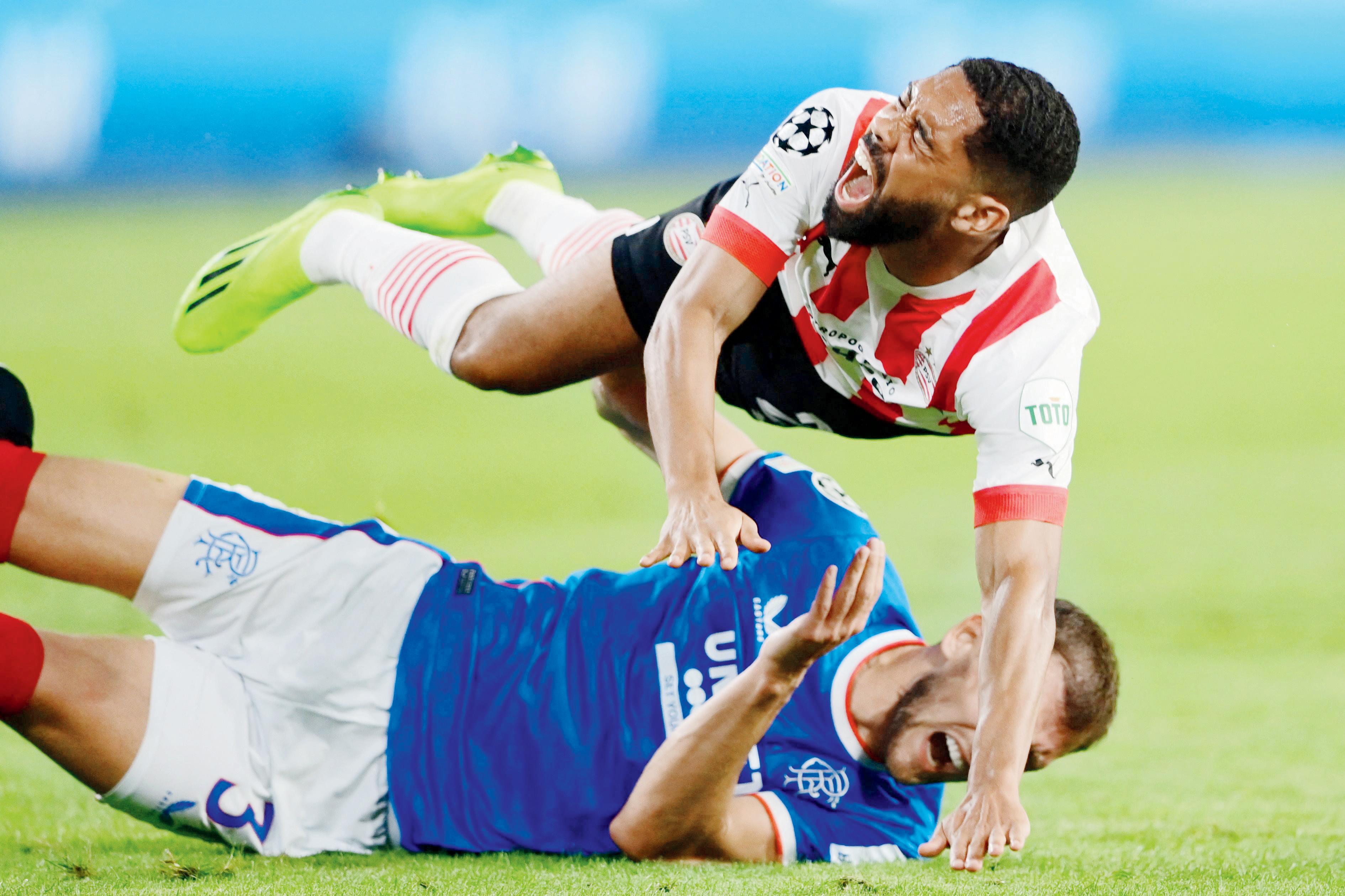 નેધરલૅન્ડ્સના એઇન્ડ્હોવેન શહેરમાં રમાયેલી અત્યંત રસાકસીભરી ફુટબૉલ મૅચમાં એક તબક્કે પીએસવી એઇન્ડ્હોવેનનો ઑસ્ટ્રિયન ડિફેન્ડર ફિલિપ મ્વેની (ઉપર) હરીફ ટીમ ગ્લાસગો રેન્જર્સના ક્રોએશિયન ડિફેન્ડર બોર્ના બારિસિચ (નીચે) પર પડ્યો હતો અને થોડી ક્ષણ માટે રમત અટકાવાઈ હતી. અનેક ઉતાર-ચડાવ બાદ યુઈએફએ (યુઈફા) ચૅમ્પિયન્સ લીગ માટેની આ પ્લે-ઑફ મૅચ ગ્લાસ્ગો રેન્જર્સે ૧-૦થી જીતી લીધી હતી અને ૧૨ વર્ષ બાદ પહેલી વાર ચૅમ્પિયન્સ લીગના ગ્રુપ-સ્ટેજમાં સ્થાન મેળવ્યું હતું.