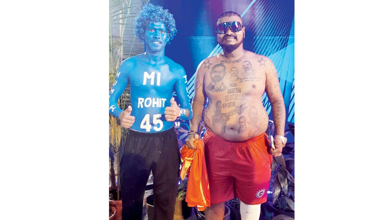 ગઈ કાલે વાનખેડેમાં મુંબઈ અને પંજાબના રેગ્યુલર કૅપ્ટનો રોહિત શર્મા અને શિખર ધવનના ચાહકોએ લોકોનું ખાસ ધ્યાન ખેંચ્યું હતું. રોહિતના ચાહકે આખું શરીર મુંબઈ ઇન્ડિયન્સના બ્લુ કલરમાં રંગીને પેટ પર એમઆઇ રોહિત સાથે તેના ટી-શર્ટનો નંબર ૪૫ લખ્યો હતો. જ્યારે ધવનપ્રેમીએ તો આખા શરીરમાં ટૅટૂ અને તેની સિદ્ધિઓ ચીતરાવી હતી. જોકે હજી સંપૂર્ણ ફિટ થયો ન હોવાથી ગઈ કાલે ધવન નહોતો રમ્યો.
