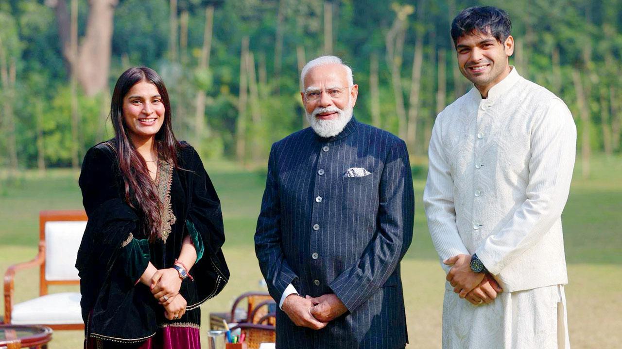 ઑલિમ્પિક્સ ચૅમ્પિયન અને સ્ટાર જૅવલિન થ્રોઅર નીરજ ચોપડા અને તેની પત્ની, ભૂતપૂર્વ ટેનિસખેલાડી હિમાની મોર લાંબા સમય બાદ ભારતમાં જોવા મળ્યાં છે. લગ્ન પછી નીરજની ટ્રેઇનિંગ અને સ્પર્ધાઓને કારણે વિદેશમાં ટ્રાવેલ કરનાર આ કપલ હાલમાં દિલ્હીમાં વડા પ્રધાન નરેન્દ્ર મોદી અને ભૂતપૂર્વ રાષ્ટ્રપતિને મળ્યું હતું. સોમવારે ભૂતપૂર્વ રાષ્ટ્રપતિ રામનાથ કોવિંદ અને તેમની ફૅમિલીના સભ્યોને મળ્યા બાદ આ કપલ ગઈ કાલે વડા પ્રધાનના નિવાસસ્થાને પહોંચ્યું હતું. નરેન્દ્ર મોદીએ આ કપલ સાથેનો ફોટો શૅર કરીને લખ્યું કે અમે રમતગમત સહિત વિવિધ મુદ્દાઓ પર અદ્ભુત વાતચીત કરી.