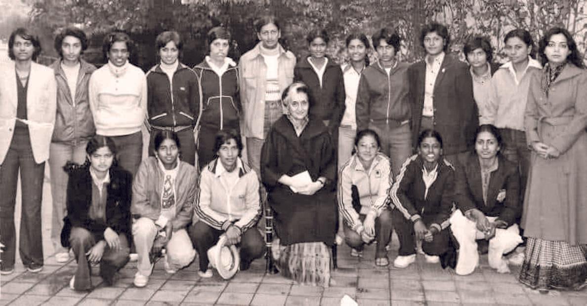 ફોટો – ૩ – ૧૯૭૯માં ભારતીય મહિલા ક્રિકેટ ટીમે ઇન્દિરા ગાંધીની મુલાકાત કરી હતી એ સમયના ફોટોમાં નીચે બેસેલી મહિલા ક્રિકેટરોમાં જમણેથી બીજા નંબરે બેસેલાં સુધા શાહ.