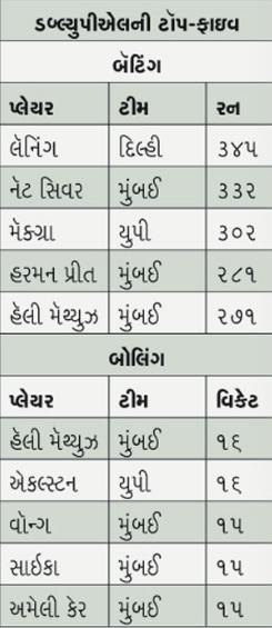 ખીચોખીચ ભરાયેલા બ્રેબર્ન સ્ટેડિયમમાં ગઈ કાલે રમાયેલી ડબ્લ્યુપીએલની પ્રથમ સીઝનની ફાઇનલમાં મુંબઈ ઇન્ડિયન્સ ૭ વિકેટે દિલ્હી કૅપિટલ્સને હરાવીને ચૅમ્પિયન બની હતી. ૧૩૨ રનનો ટાર્ગેટ મુંબઈ ઇન્ડિયન્સે ૧૯.૩ ઓવરમાં ૩ વિકેટ ગુમાવીને મેળવી લીધો હતો. ૫૫ બૉલમાં ૬૦ રનની યાદગાર ઇનિંગ્સ રમનાર વુમન ઑફ ધ મૅચ નૅટ સિવર-બ્રન્ટે વિજય બાઉન્ડરી ફટકારી હતી. અમેલિયા કેર ૧૪ રન સાથે અણનમ રહી હતી, જ્યારે કૅપ્ટન હમરનપ્રીત કૌર ૩૭ રન ઉપયોગી ઇનિંગ્સ રમીને રનઆઉટ થઈ ગઈ હતી. હૅલી મૅથ્યુઝ ૧૩ અને યાસ્તિકા ભાટિયા ચાર રન બનાવી શકી હતી.