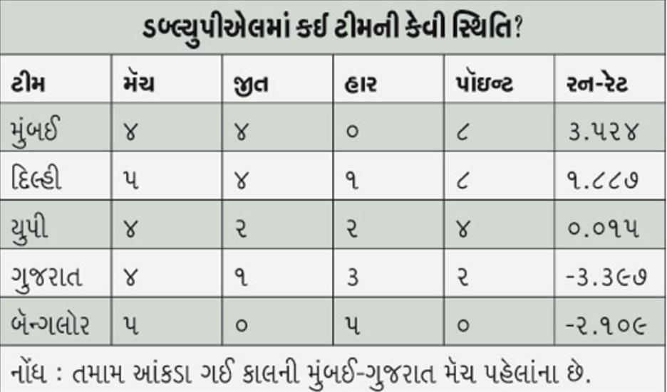 બૅન્ગલોર આ ટુર્નામેન્ટમાંથી ઑલમોસ્ટ આઉટ થઈ ગયું કહેવાય, પરંતુ આંકડાની રીતે એને નૉકઆઉટ માટે નજીવો ચાન્સ છે. જોકે બાકીની ટીમની મોટા ભાગની મૅચોનાં પરિણામ પોતાની ફેવરમાં આવે એ બૅન્ગલોર માટે જરૂરી છે. હવે બૅન્ગલોરની આજે યુપી સામે, શનિવારે ગુજરાત સામે અને મંગળવારે મુંબઈ સામે મૅચ છે. બૅન્ગલોર બાકીની ત્રણેય મૅચ જીતીને કુલ ૬ પૉઇન્ટ ધરાવે અને બીજી બાજુ યુપી તથા ગુજરાત તમામ મૅચ હારી જતાં અેમના ૪-૪ પૉઇન્ટ પર જ રહે તો બૅન્ગલોર માટે ટૉપ-થ્રીના નૉકઆઉટમાં પહોંચવું સંભવ બનશે.