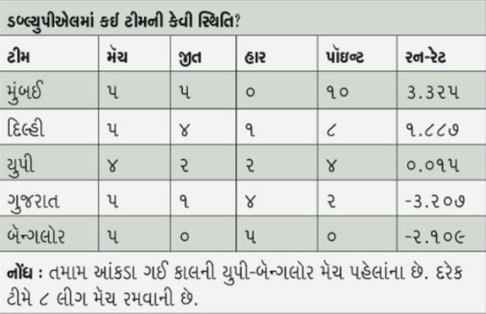મંગળવારે મુંબઈ સામે ગુજરાતની એકેય બૅટર પચીસ રન પણ નહોતી બનાવી શકી. હર્લીન દેઓલના બાવીસ રન ટીમમાં હાઇએસ્ટ હતા. કૅપ્ટન સ્નેહ રાણાએ ૨૦ રન બનાવ્યા હતા. ૮ માર્ચે બ્રેબર્નમાં ૬૫ રન બનાવીને ગુજરાતને વિજય અપાવનાર ઓપનર સોફિયા ડન્ક્લી મંગળવારે મુંબઈની નૅટ સિવર-બ્રન્ટના પહેલા જ બૉલમાં એલબીડબ્લ્યુ થઈ ગઈ હતી. મુંબઈ વતી ચારેય વિદેશી ખેલાડીએ વિકેટ લીધી હતી. હૅલી મૅથ્યુઝે તથા નૅટ સિવરે સૌથી વધુ ત્રણ-ત્રણ વિકેટ તેમ જ ઍમેલી કેરે બે અને ઇસ્સી વૉન્ગે એક વિકેટ લીધી હતી. ટુર્નામેન્ટમાં સૌથી વધુ ૧૨ વિકેટ લઈને પર્પલ કૅપ મેળવનાર ભારતની સાઇકા ઇશાકને અને એક ઓવર બોલિંગ કરનાર અમનજોત કૌરને વિકેટ નહોતી મળી.