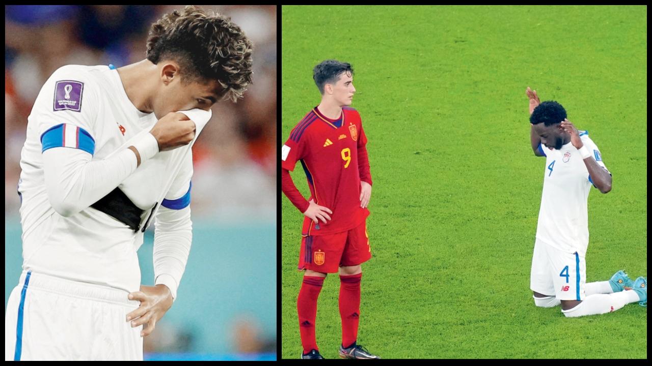 બુધવારે સ્પેન સામેના ૦-૭ના પરાજયથી હતાશ કોસ્ટા રિકાનો અલ્વેરો ઝમોરા (ડાબે) અને ખરાબ રીતે હાર્યા પછી સ્પેનના ખેલાડી સામે ઘૂંટણિયા ટેકવતો કોસ્ટા રિકાનો કેશર ફુલર. તસવીર એ.પી.