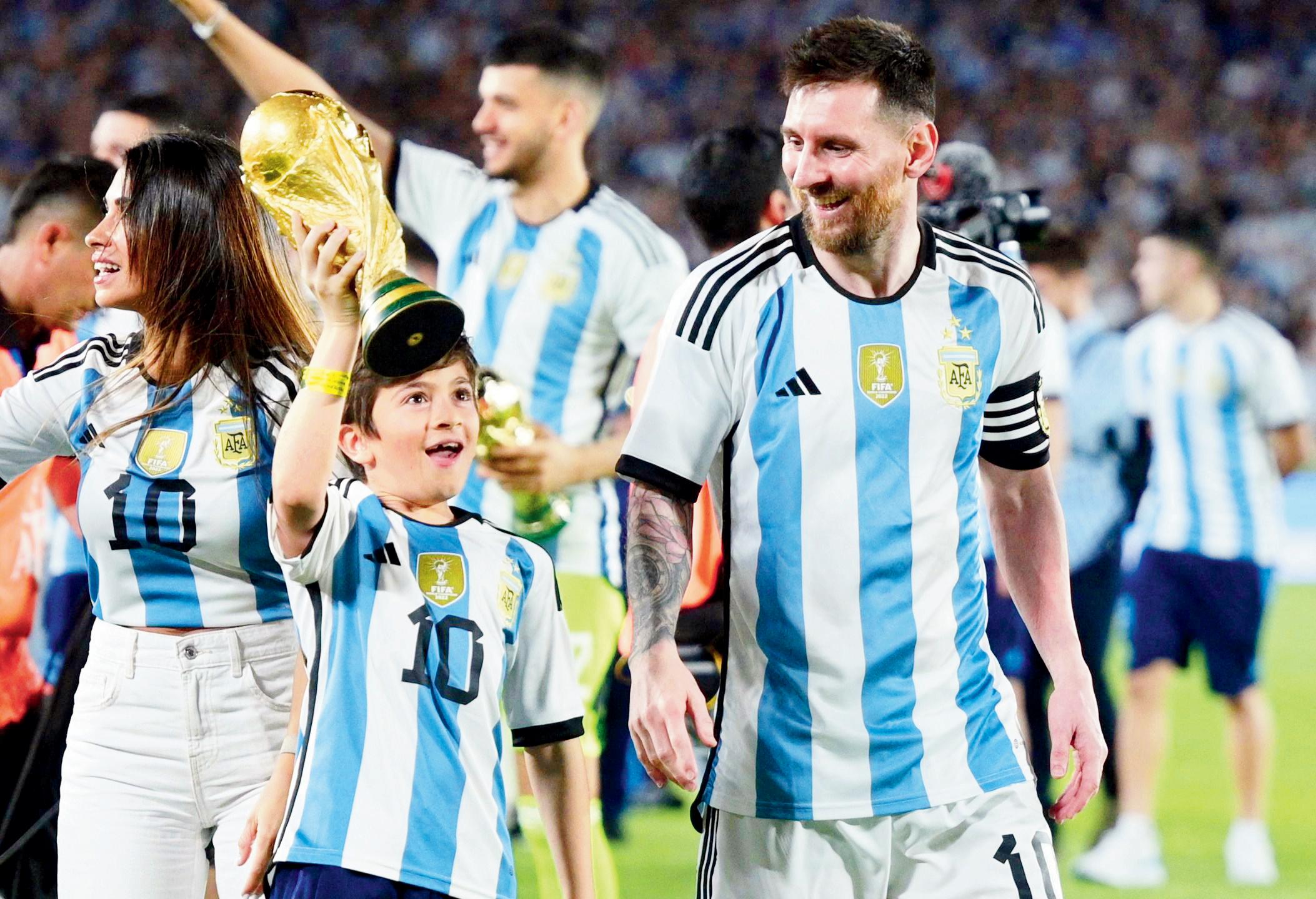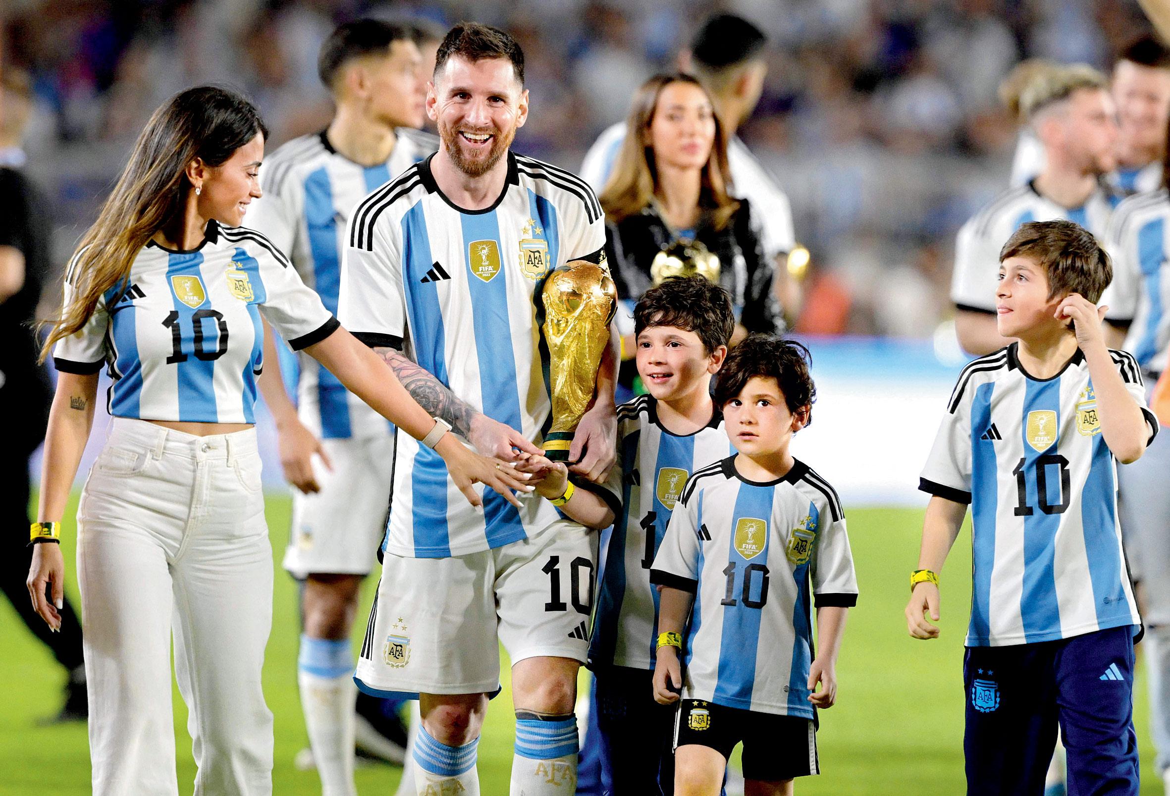આર્જેન્ટિનાની રાજધાની બ્યુનસ આયરસમાં ૮૩,૦૦૦ લોકોથી ખીચોખીચ ભરાયેલા સ્ટેડિયમના મેદાન પર મેસી વર્લ્ડ કપની ટ્રોફી હાથમાં લઈને પત્ની ઍન્ટોનેલા તેમ જ ત્રણેય પુત્રો ટિઍગો, મૅટીઓ અને સિરો સાથે આવી રહ્યો હતો ત્યારે લોકોએ આ પ્રાઉડ ફૅમિલીનું અભિવાદન કર્યું હતું.
