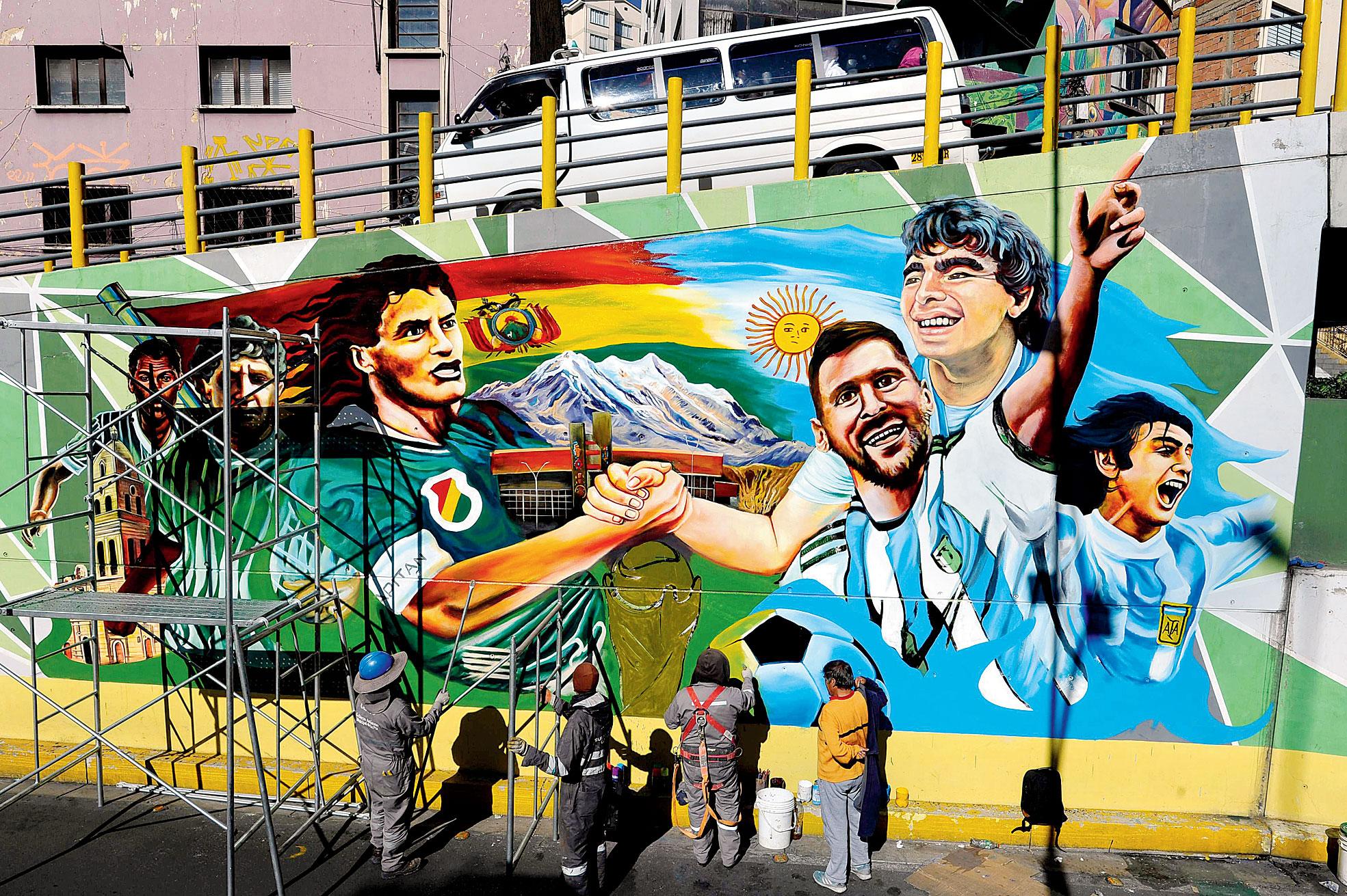 દક્ષિણ અમેરિકાના દેશ બોલિવિયાના પાટનગર લા પાઝમાં ગઈ કાલે આર્જેન્ટિના અને બોલિવિયા વચ્ચેની ફિફા વર્લ્ડ ક્વૉલિફાયર પહેલાં શહેરમાં ઠેકઠેકાણે સુપરસ્ટાર ફુટબોલર લિયોનેલ મેસીનાં પોસ્ટર લાગ્યાં હતાં. એવા એક પોસ્ટરમાં મેસી (જમણેથી ત્રીજો) સાથે મહાન ખેલાડી ડિએગો મૅરડોના તેમ જ આર્જેન્ટિનાના જ મારિયો કેમ્પેસ (જમણે)ને તેમ જ બોલિવિયાના ખેલાડીઓ (ડાબેથી) માર્કો ઍન્ટોનિયો એટ્ચેવેરી, કાર્લોસ બૉર્યા અને રામિરો કૅસ્ટિલોને બતાવાયા હતા. બોલિવિયામાં મેસી ખૂબ લોકપ્રિય છે, પણ ગઈ કાલની મૅચ પહેલાં તેણે પ્રૅક્ટિસમાં ભાગ ન લીધો હોવાથી તેના અનેક ચાહકો નારાજ થયા હતા.